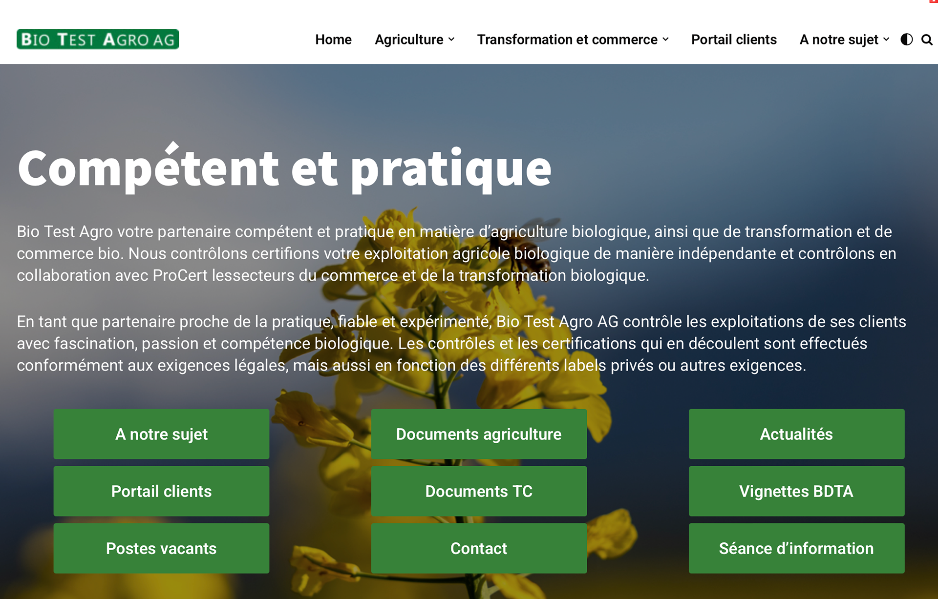 Bio Test Agro est notre partenaire compétent en matière d’agriculture biologique, BIO-Test-Agro contrôle et certifie les exploitations agricoles biologiques de manière indépendante. Il s’agit d’un partenaire proche de la pratique, fiable et expérimenté, les contrôles et les certifications qui en découlent sont effectués conformément aux exigences légales, mais aussi en fonction des différents labels privés ou autres exigences.
