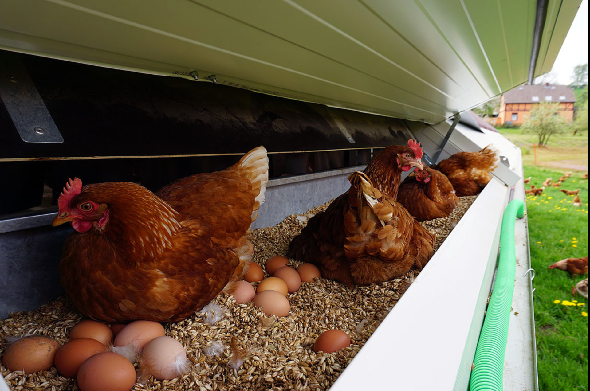 Nos poulaillers mobiles peuvent contenir jusqu’à 290 poules pondeuses chacun. Cela génère et assure une production riche en protéines et bon marché. Nos poules sont non seulement élevées en plein air sur de l’herbe fraiche mais également déplacées tous les 15 jours. Des distributeurs à grains leurs assurent des compléments.. Les œufs se trouvent donc enrichis en oméga 3.